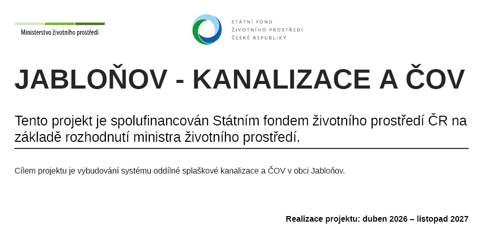 Cílem projektu je vybudování systému oddílné splaškové kanalizace a ČOV v obci Jabloňov.